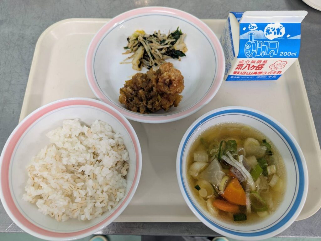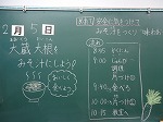 地域の畑で収穫させていただいた大蔵大根を使って、各クラスで料理を作り、地場産の野菜の素晴らしさを堪能しています。この日も、いい香りが家庭科室から漂ってきたので、おすそ分けをしてもらおうと張り切ってのぞきに行ったのですが、すでにきれいに片付けが終わった後・・・。黒板の写真だけは撮れました・・・。残念・・・。