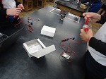 理科の時間に、電気の学習をしています。この日は、手回し発電機や太陽光パネルを使って、コンデンサに電気をためる実験をしました。コンデンサを豆電球や電子オルゴール、モーターなどにつないで、電気のたまり方を確認します。時間などの条件をそろえて実験し、結果を比べて考える力がしっかりと育っています。