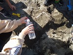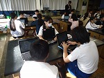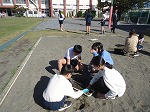 理科の時間に、流れる水の働きと土地のつくりについて学習しています。この日は、どんな実験をするかを理科室で話し合った後に、校庭の砂場に行き、グループごとに実際に水を流して砂の様子の変化を観察しました。この実験の結果をもとに、川の上流と下流の違いについて考えをまとめていきます。