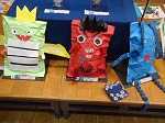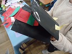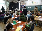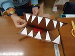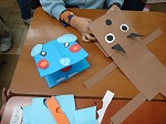 図工の時間に、口をパクパクさせて遊ぶ動物を色画用紙で作りました。まずはどんな動物を作るかを絵に描いてイメージしてから工作に入ります。教室の真ん中にある材料スペースから、児童は自分の作品のイメージに合った材料を自由に持っていき作業を進めます。子供らしいのびのびとした楽しい発想で作られたすてきな作品が完成しました。