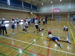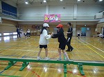 体育の時間に、体育館で体つくりの運動遊びをしています。様々な道具が置かれているコーナーをグループごとに順番に回り、動き方を工夫しながら楽しく体を動かしました。