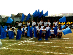 4年生表現「島風ダイナミック」。太鼓の音を響かせて力強く踊ります。予定より29分早くスタートしています。