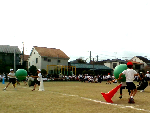 低学年団体競技「おみこしリレー」。力を合わせて大玉を運びます。得点競技もあと2種目。応援にも力が入ります。予定より22分早くスタートしています。