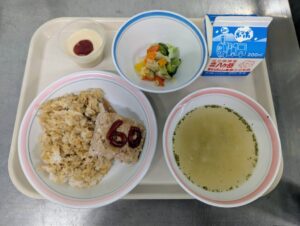 60周年記念集会に合わせて、お祝い給食がありました。お祝い絶品ガーリックライス、お絵かきジャンボハンバーグ、こくうま60thスペシャルコンソメスープ、ABCパスタサラダ、祝 紅白豆乳ブランマンジェ(いちごソース)と、児童がウキウキするメニューが勢ぞろいです。ジャンボハンバーグは、バットいっぱいに広げられた1枚の大きなハンバーグが各教室に届き、児童がケチャップで絵やお祝いの言葉をかいてから、小分けにして配膳するという楽しい企画つきの楽しいメニューでした。フェスティバル、式典、集会と続いてきた周年行事ですが、お祝い給食で一区切りです。学校がとてもすてきな雰囲気に包まれた3週間でした。御協力いただいた全ての皆様に、心より感謝申し上げます。
