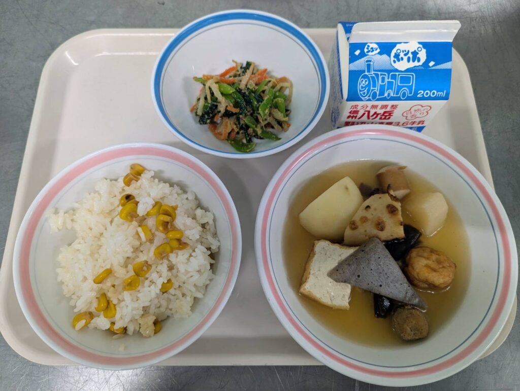 コーンちゃめし/おでんふうに/ごまあえ/ぎゅうにゅう