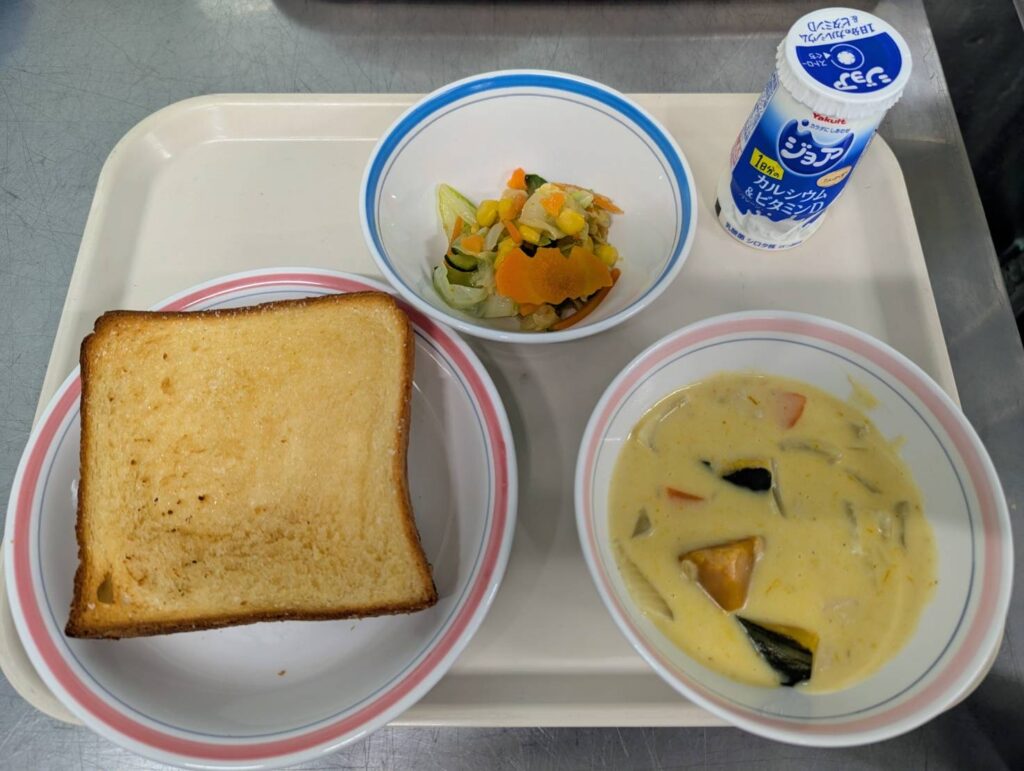メープルシュガートースト/かぼちゃのクリームシチュー/ひよこまめのサラダ/ぎゅうにゅう