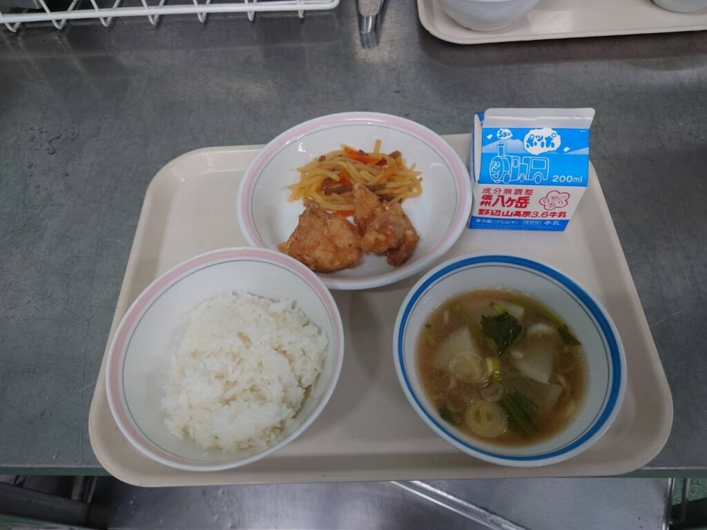 2/24ごはん/とりのからあげ/じゃがいものきんぴら/かぶのみそしる/ぎゅうにゅう