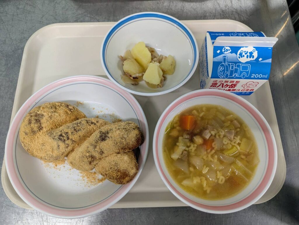 もちもちきなこあげパン/ジャーマンポテト/ABCコロコロスープ/ぎゅうにゅう