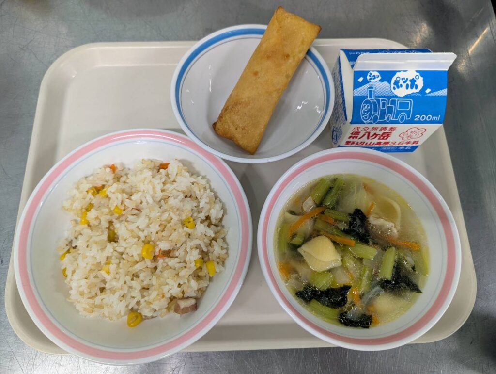 コーンピラフ/マカロニスープ/さつまいもとりんごのつつみあげ/ぎゅうにゅう