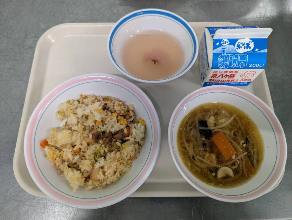 ごもくチャーハン/ちゅうかスープ/さくらゼリー/ぎゅうにゅう