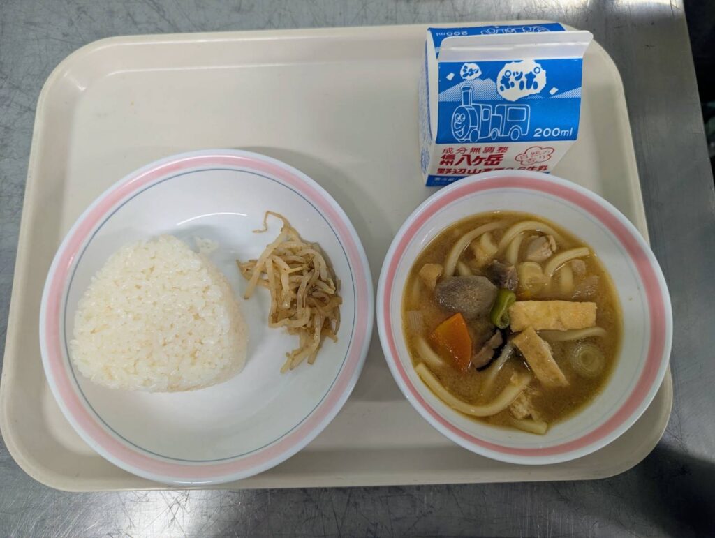 しおおにぎり/けんちんうどん/たくあんいため/ぎゅうにゅう