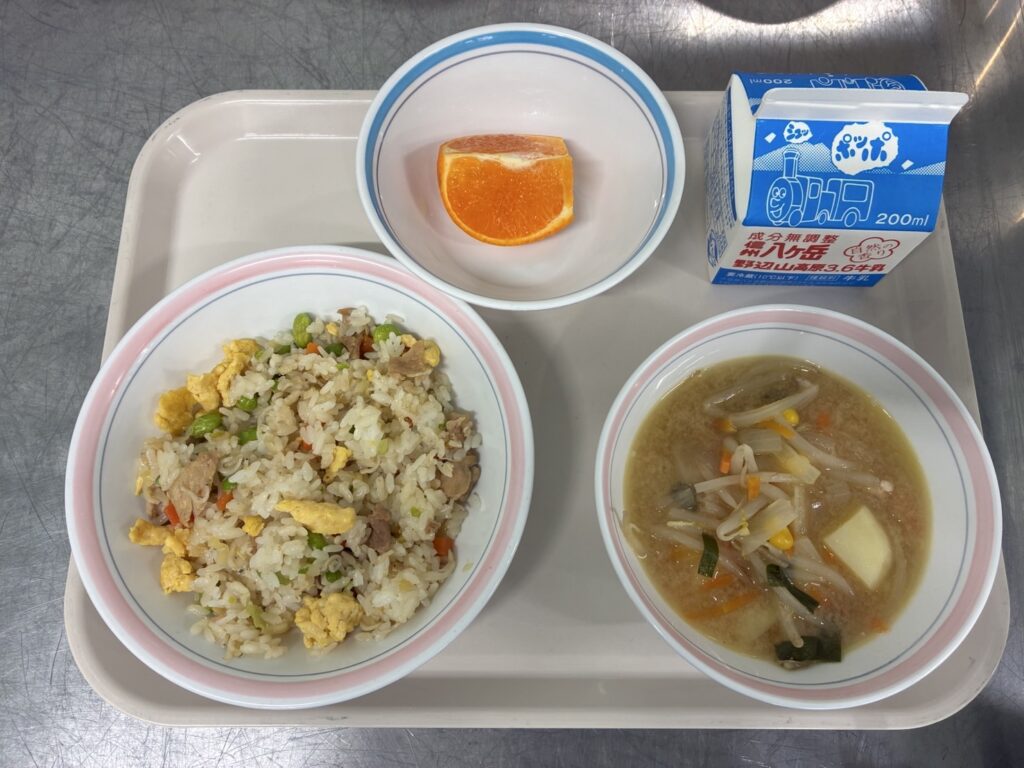 じゃこチャーハン/さっぽろみそスープ/くだもの/ぎゅうにゅう