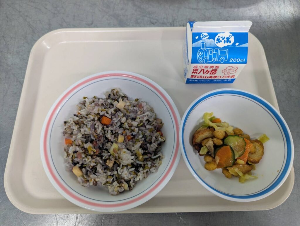たくあんとあぶらあげのまぜごはん/しおちゃんこじる/くだもの/ぎゅうにゅう