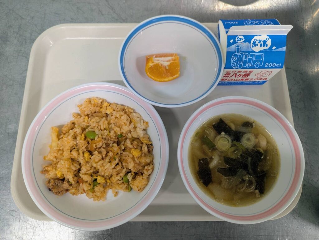 1/20キムチーズチャーハン/ピリからわかめスープ/くだもの/ぎゅうにゅう
