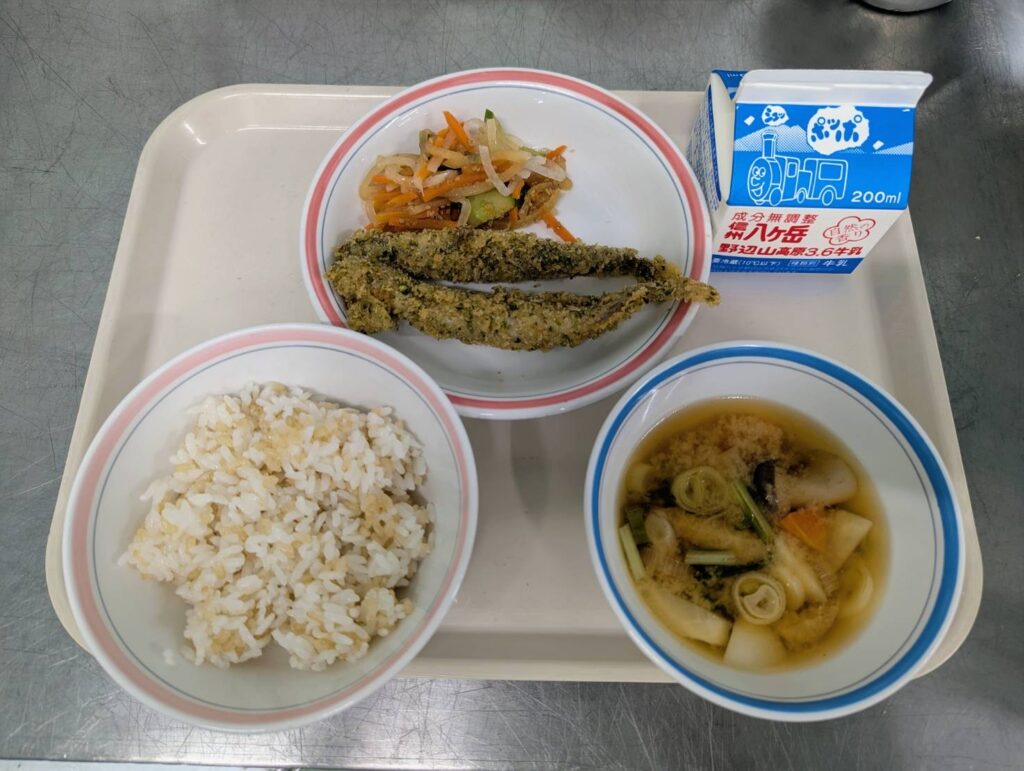 10/16もちもちげんまいごはん/ししゃもののりフライ/さっぱりサラダ/かぶのみそしる/ぎゅうにゅう
