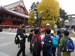 社会科見学で、浅草に出かけました。午前中は、グループごとにガイドさんについていただき、浅草寺周辺を散策しながら浅草について詳しく教えていただきました。途中冷たい雨が降ってきましたが、お昼は、台東区民会館の部屋をお借りして食べたので、ゆっくりと体を休めることができました。午後は浅草寺に戻り、グループごとに外国の方にインタビュー。事前の外国語活動の時間に準備をしていたので、やる気満々で声を掛ける姿が見られました。最後はお待ちかねのお土産購入。家族のためにという思いでお土産を選ぶ児童が多く、ほっこりした気持ちになりました。バスの運転手の方や様々な施設の方に礼儀正しく挨拶する姿も印象的でした。