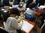 家庭科の時間に、ご飯の炊き方とみそ汁の作り方について学習しています。この日は、「健康に過ごすためにはどのように食べればよいか?」「おいしく作るためにはどのように工夫すればよいか?」という視点で調べ学習を行い、調理実習を行うための準備を進めました。一人で集中して教科書を読んで自分の考えをまとめる児童、友達と考えを交流しながら自分の考えをまとめる児童、それぞれに合った学習を選び、意欲的に学習に取り組む姿が見られました。